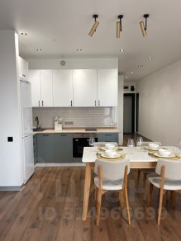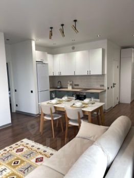 Большая кухня-гостиная и еще две отдельные комнаты спальни. Видовые окна от пола до потолка, смотрят на три стороны света, от северо востока по окружности до северо запада! Прекрасный вид!