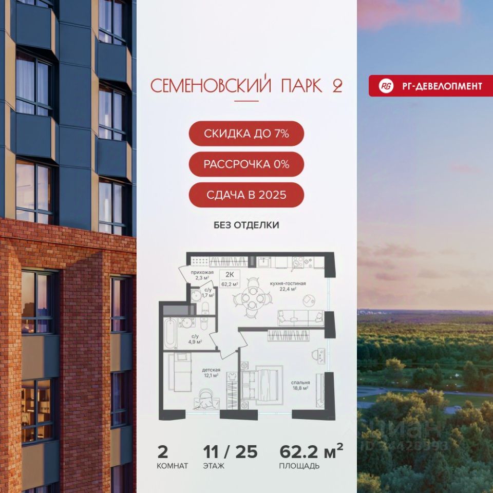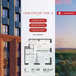 Продается 2-к квартира 62,2 кв.м. в ЖК "Семеновский парк 2" на 11-м этаже 25 этажного дома.