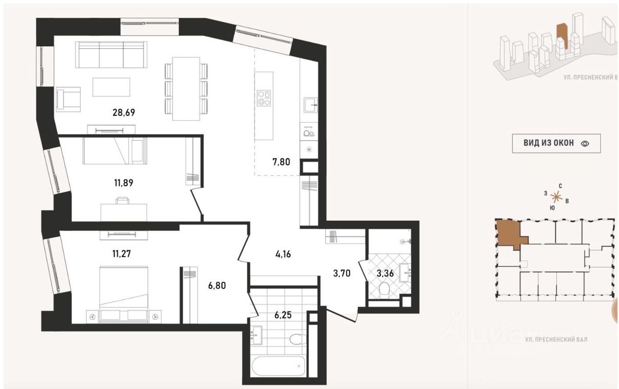 Имеет прекрасные видовые характеристики на Центральный московский ипподром, стадион Динамо, Останкинскую башню. Гарантированный вид на долгие годы, ничего не построят впереди.