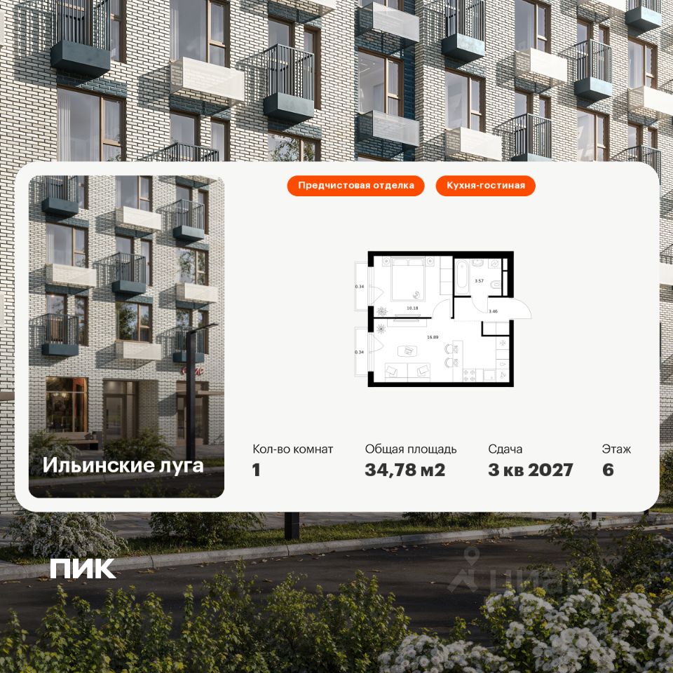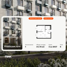 Продаётся 1-комн. квартира площадью 34,78 кв.м на 6 этаже 9 этажного дома (Корпус 4.2, Секция 4) проекта ПИК Ильинские луга. Светлый просторный подъезд на уровне земли, функциональная планировка, большие окна, предчистовая отделка.