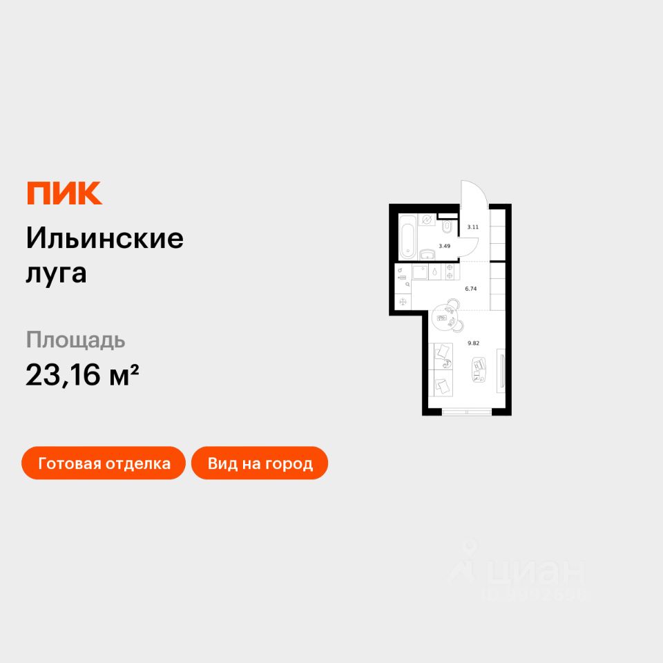 Продаётся квартира-студия площадью 23,16 кв.м на 9 этаже 9 этажного дома (Корпус 4.1, Секция 4) проекта ПИК Ильинские луга. Светлый просторный подъезд на уровне земли, функциональная планировка, большие окна, c отделкой.