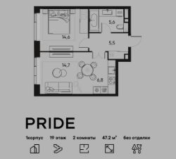 В премиальном жилом квартале PRIDE продается 2-комнатная квартира в 1 корпусе, на 19 этаже, в секции 3. Её общая площадь составляет 47.2 м². Пространство включает 1 уютную спальню 14,6 м², просторную кухню-гостиную 21,5 м² и ванную комнату 5,6 м². Ключи в 2026 году.