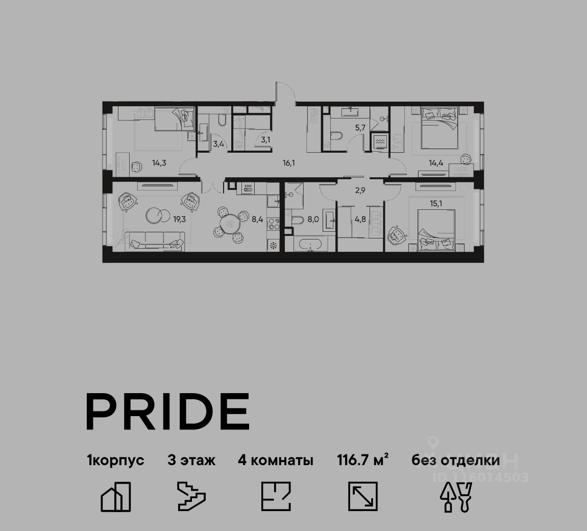 В премиальном жилом квартале PRIDE продается 4-комнатная квартира в 1 корпусе, на 3 этаже, в секции 6. Её общая площадь составляет 116.7 м². Пространство включает 3 уютные спальни 14,3 м², 14,4 м², 15,1 м², просторную кухню-гостиную 27,7 м² и 2 ванные комнаты 8 м² и 5,7 м². Ключи в 2026 году.
