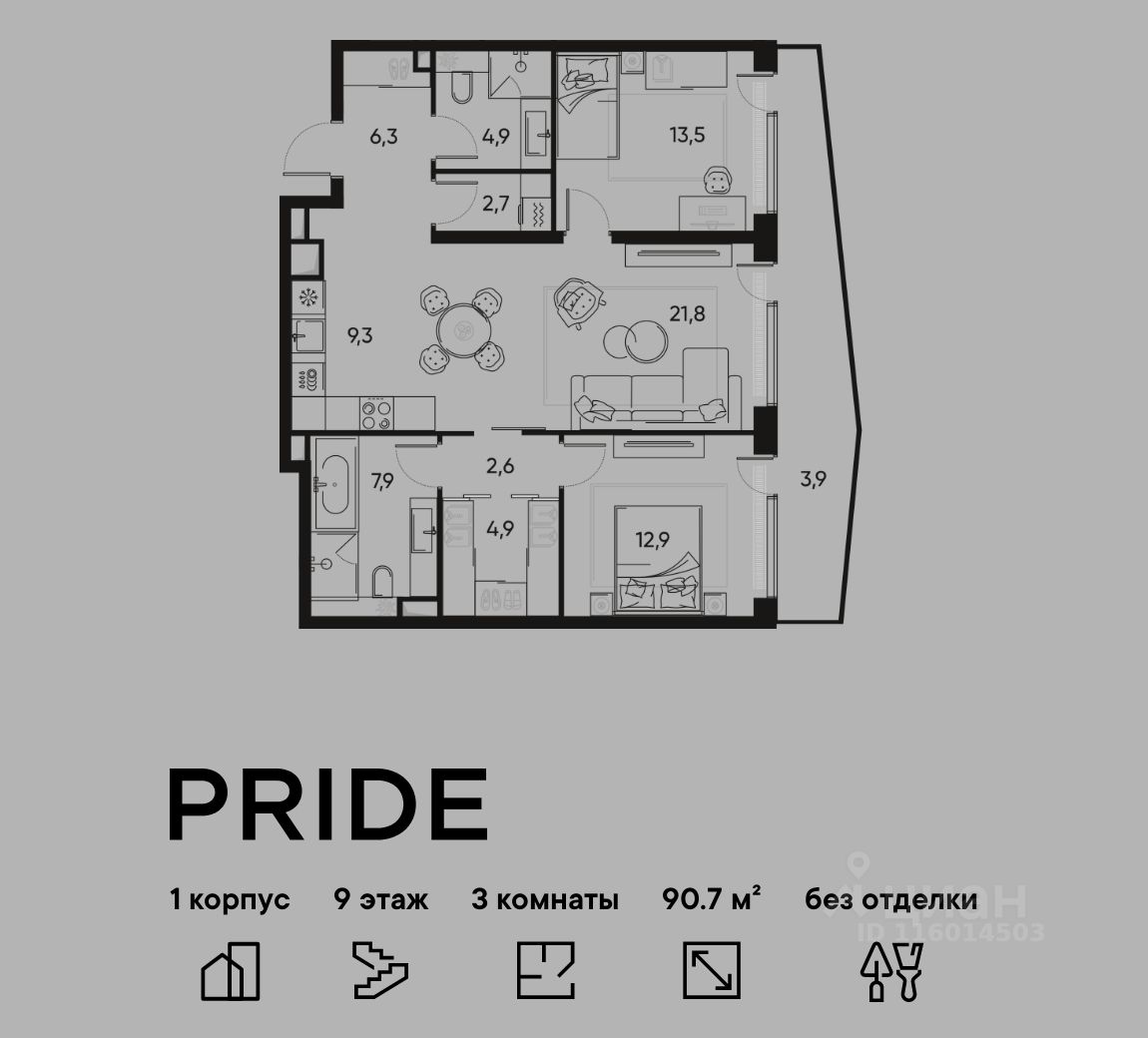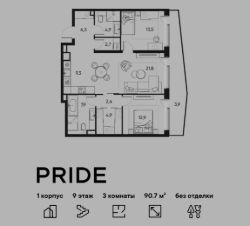 В премиальном жилом квартале PRIDE продается 3-комнатная квартира в 1 корпусе, на 9 этаже, в секции 10. Её общая площадь составляет 90.7 м². Пространство включает 2 уютные спальни 13,5 м², 12,9 м², просторную кухню-гостиную 31,1 м² и 2 ванные комнаты 7,9 м² и 4,9 м². Ключи в 2026 году.
