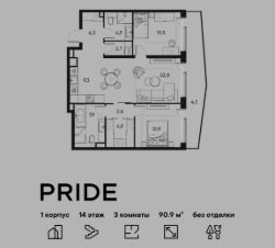 В премиальном жилом квартале PRIDE продается 3-комнатная квартира в 1 корпусе, на 14 этаже, в секции 10. Её общая площадь составляет 90.9 м². Пространство включает 2 уютные спальни 13,5 м², 12,9 м², просторную кухню-гостиную 32,1 м² и 2 ванные комнаты 4,9 м² и 7,9 м².