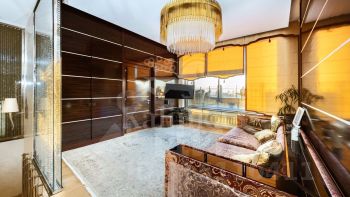 Выполнена дизайнерская отделка в стиле арт-деко с использованием оникса и мрамора. Вся квартира укомплектована дизайнерской мебелью итальянского бренда Visionnaire.