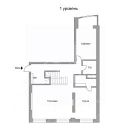 Первый уровень: кухня, просторная гостиная, рабочий кабинет, гостевой санузел, гардеробная при входе. Высота потолков на первом уровне — 4,10 м.