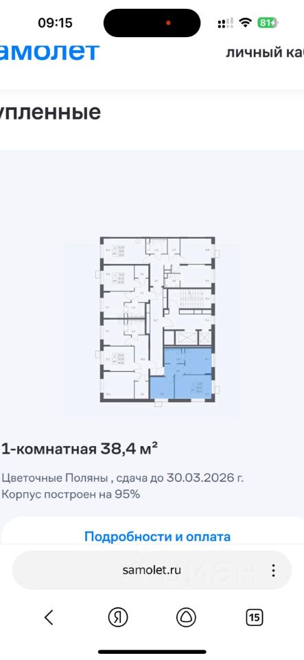 Предлагается к продаже однокомнатная квартира без отделки 38,4 кв.м в ЖК "Цветочные поляны" в Новой Москве. Квартира расположена на 7 этаже 16 ти этажного кирпичного дома (корпус 4-5, секция 13).