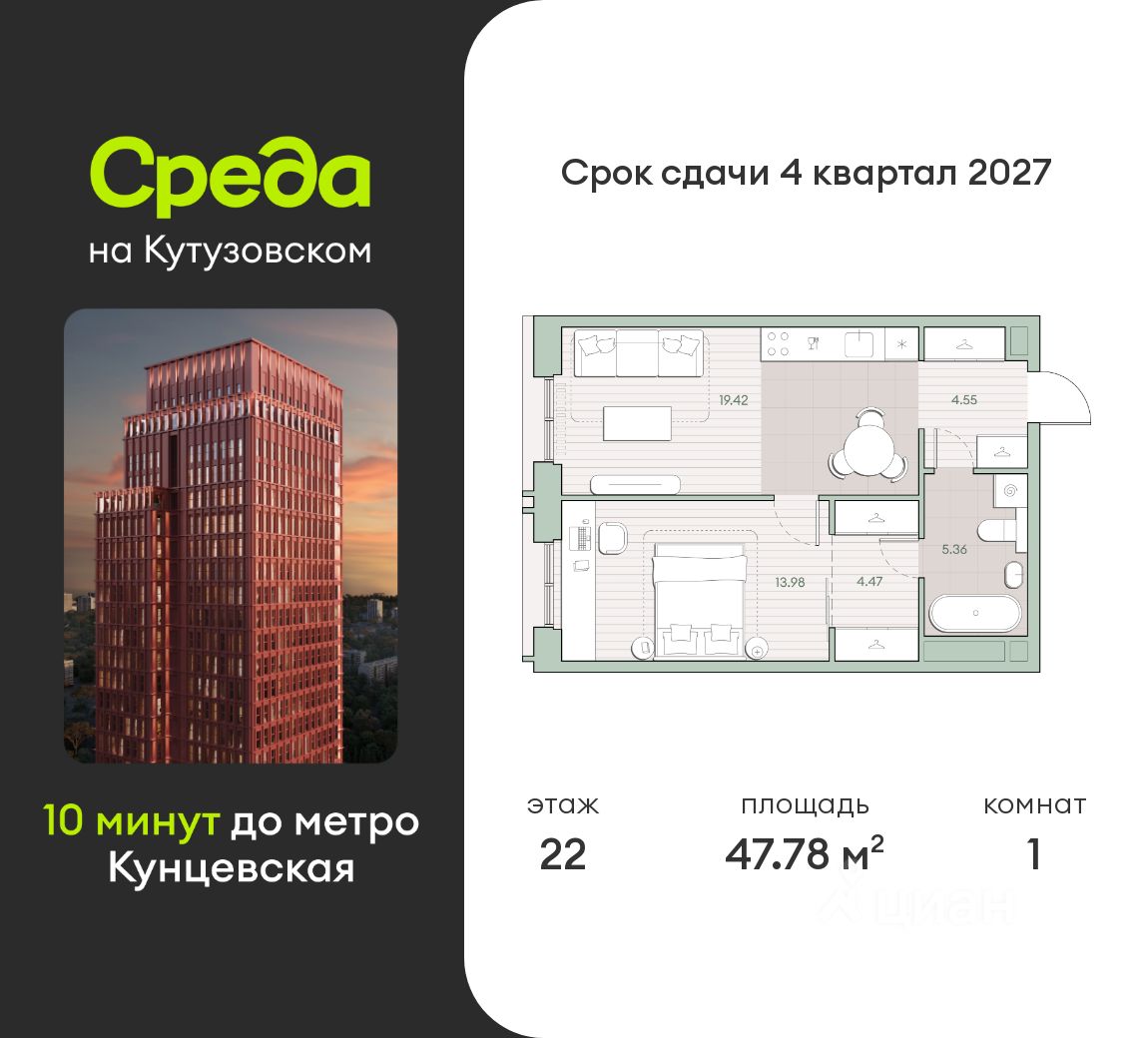 Продаётся 1-комнатная квартира общей площадью 47.78 кв.м. с отделкой white box. Квартира расположена на 22 этаже корпуса 5 в жилом комплексе бизнес-класса "Среда на Кутузовском" в пешей доступности от метро "Кунцевская".
