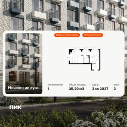 Продаётся 1-комн. квартира площадью 35,2 кв.м на 2 этаже 9 этажного дома (Корпус 4.3, Секция 6) проекта ПИК Ильинские луга. Светлый просторный подъезд на уровне земли, функциональная планировка, большие окна, предчистовая отделка.