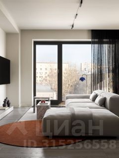 Просторная гостиная с большими панорамными окнами наполняет пространство естественным светом и открывает захватывающие виды на реку. В центре комнаты расположен элегантный диван и стильный журнальный столик, что создает идеальное место для отдыха и встреч с друзьями.