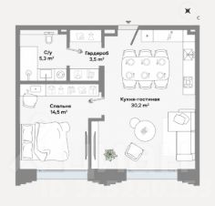Планировка апартамента: спальня, кухня-гостиная, гардеробная, санузел.