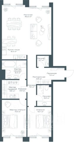 Мастер-спальня: просторная комната с отдельным гардеробной зоной, обеспечивающей достаточно места для хранения вещей и создания уютной обстановки.