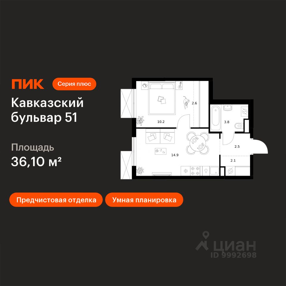 Продаётся 1-комн. квартира площадью 36,1 кв.м на 24 этаже 24 этажного дома (Корпус 3.5, Секция 2) проекта ПИК Кавказский бульвар 51. Светлый просторный подъезд на уровне земли, функциональная планировка, большие окна, предчистовая отделка.