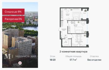 Продаётся 2-к квартира 57,7 кв.м. в ЖК "Михалковский" на 18-м этаже 20 этажного дома.