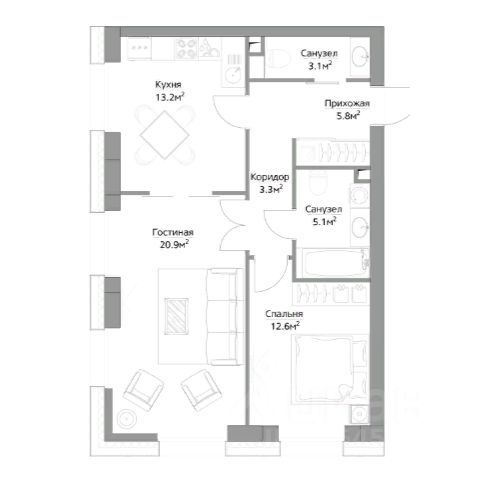 О квартире: 2 с/у (раздельный и совмещенный), 2 изолированные комнаты, вместительная кухня.