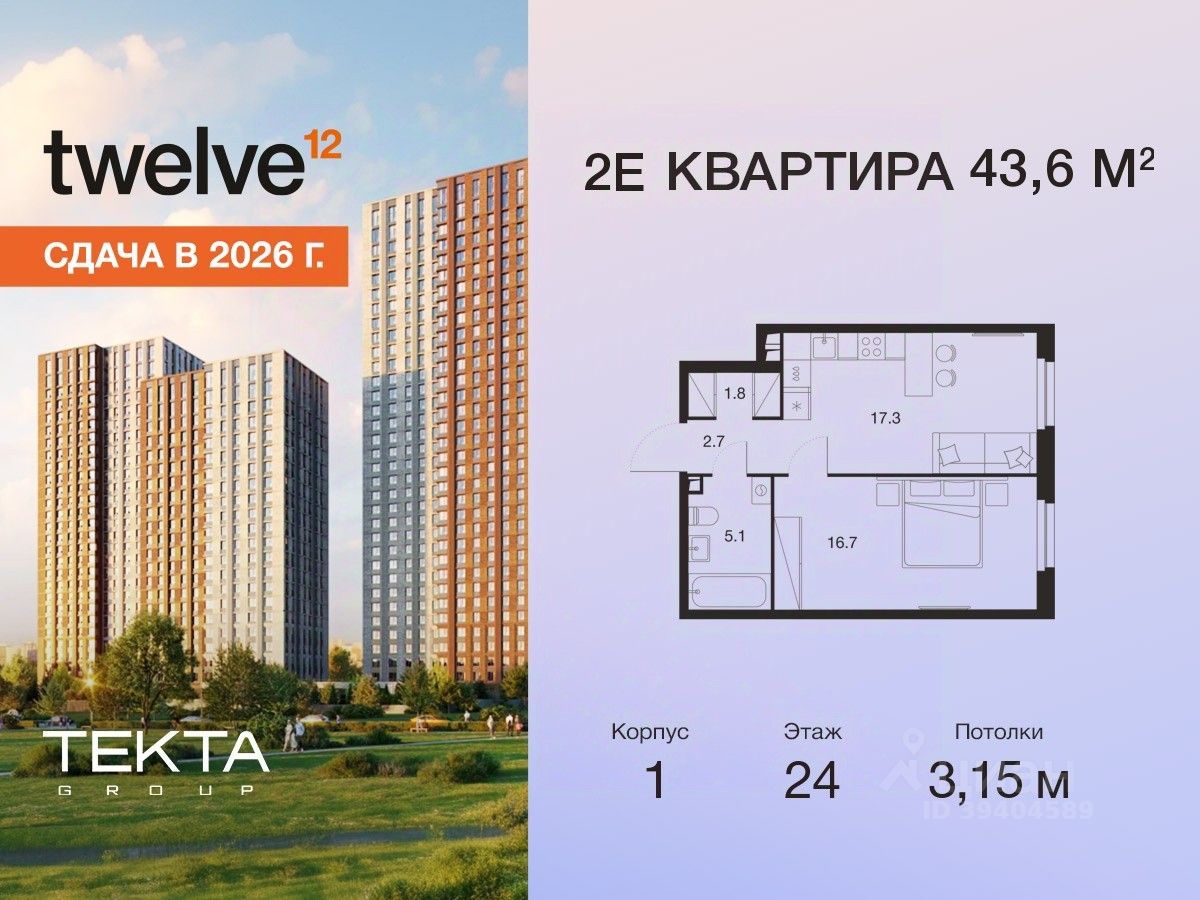 2-комн. квартира в ЖК "Твелв" на 24 этаже в 34 этажном здании Корпус 1. Общая площадь: 43.6 кв.м., жилая: 27.90 кв.м. Высота потолков 3.15 м.