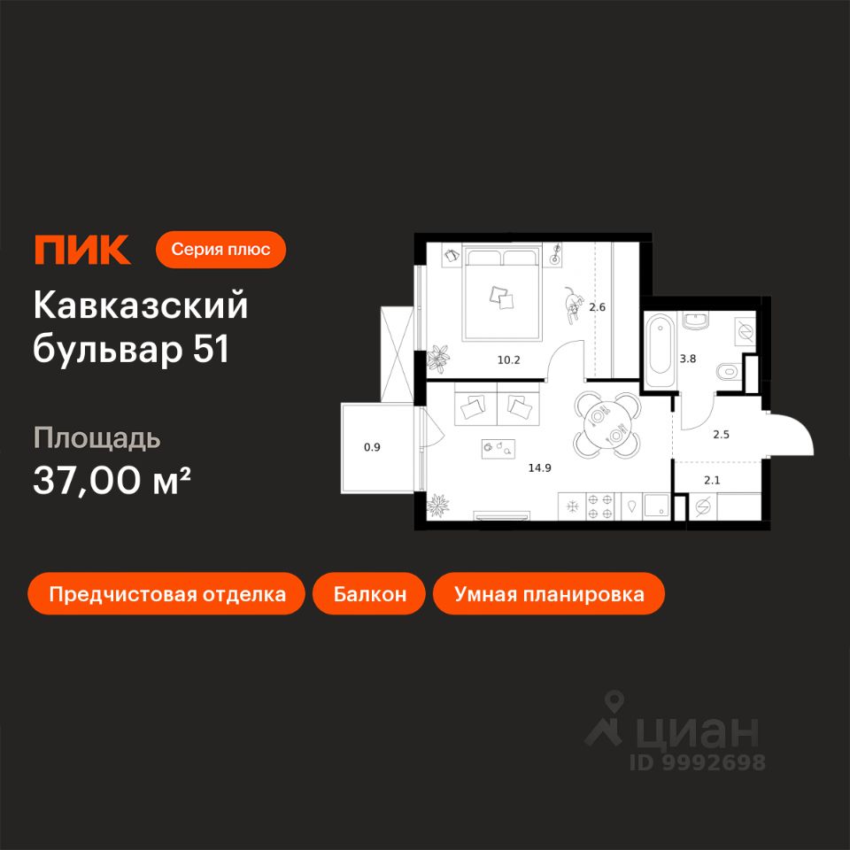 Продаётся 1-комн. квартира площадью 37 кв.м на 9 этаже 24 этажного дома (Корпус 3.5, Секция 2) проекта ПИК Кавказский бульвар 51. Светлый просторный подъезд на уровне земли, функциональная планировка, большие окна, предчистовая отделка.