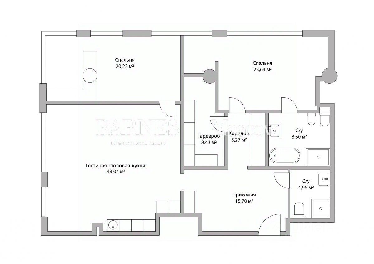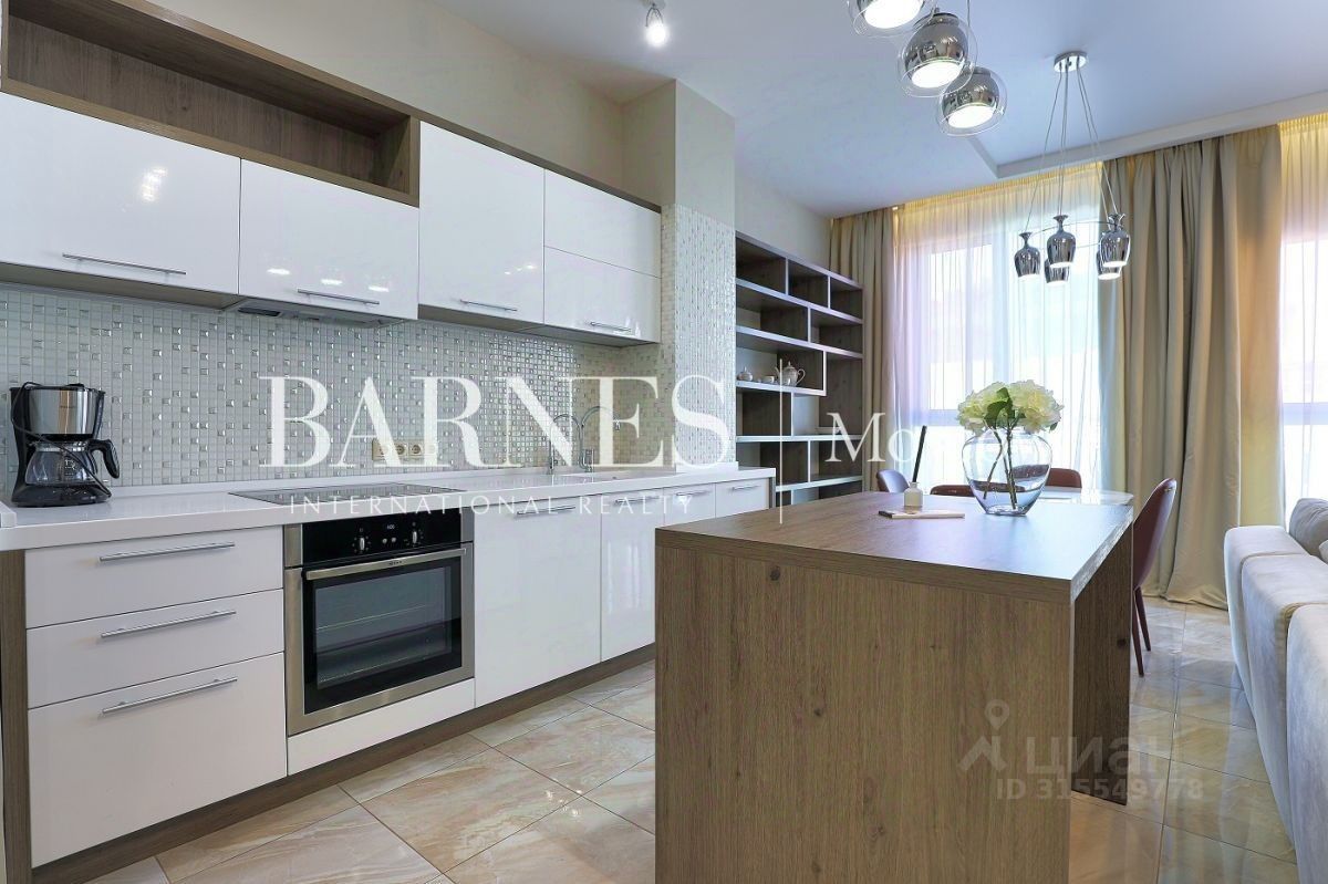 В квартире выполнена качественная отделка в приятных светлых тонах. Планировочным решением предусмотрены: просторная гостиная с зоной кухни-столовой, 2 спальни, 2 санузла, гардеробная, прихожая.