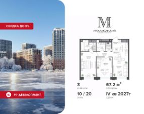 Продаётся 3-к квартира 67,2 кв.м. в ЖК "Михалковский" на 10-м этаже 20 этажного дома.