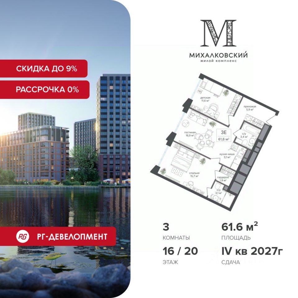 Продаётся 3-к квартира 61,6 кв.м. в ЖК "Михалковский" на 16-м этаже 20 этажного дома.