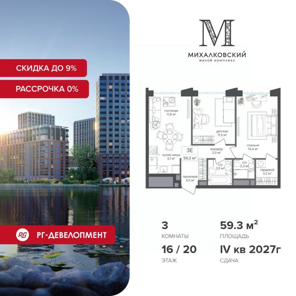 Продаётся 3-к квартира 59,3 кв.м. в ЖК "Михалковский" на 16-м этаже 20 этажного дома.