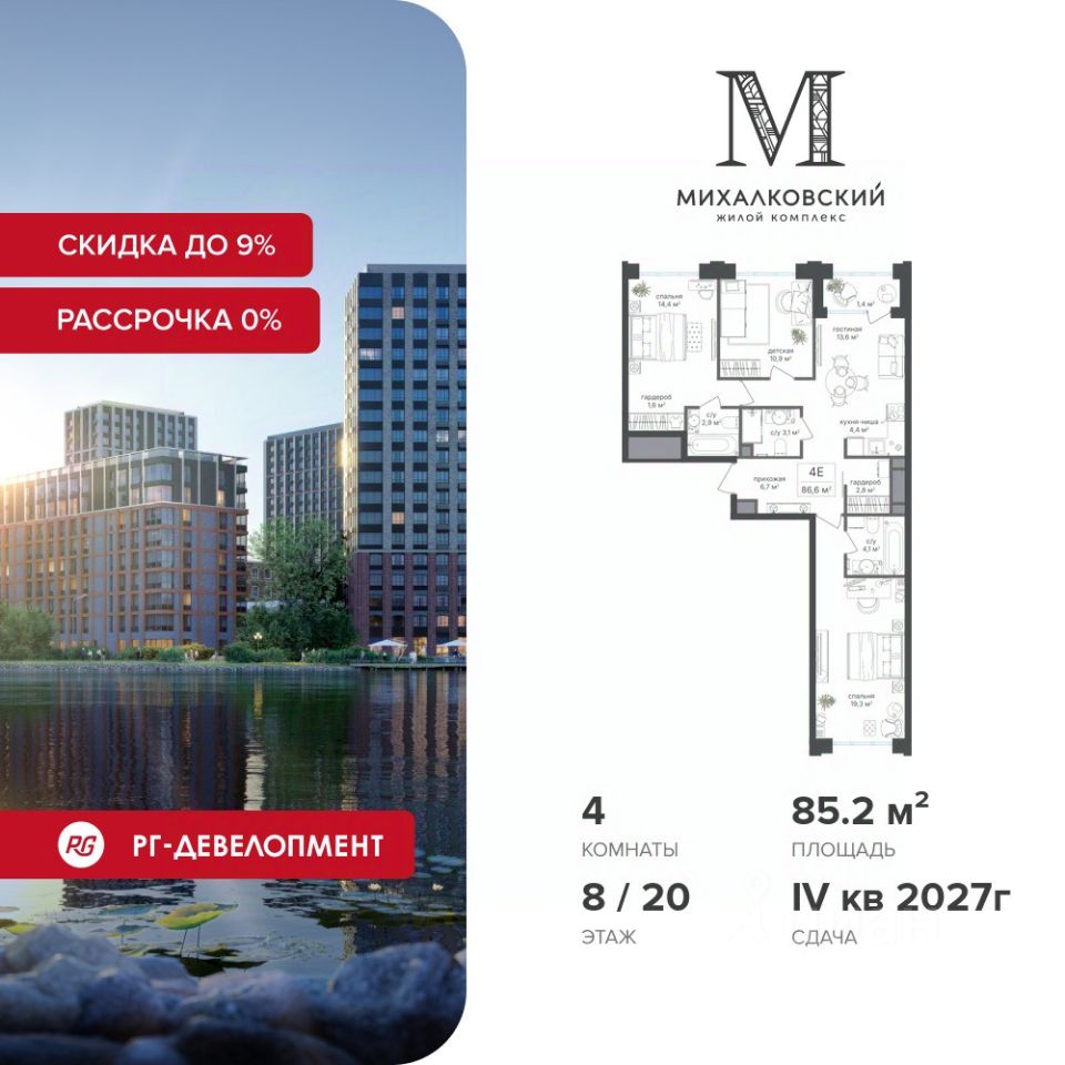 Продаётся 4-к квартира 85,2 кв.м. в ЖК "Михалковский" на 8-м этаже 20 этажного дома.