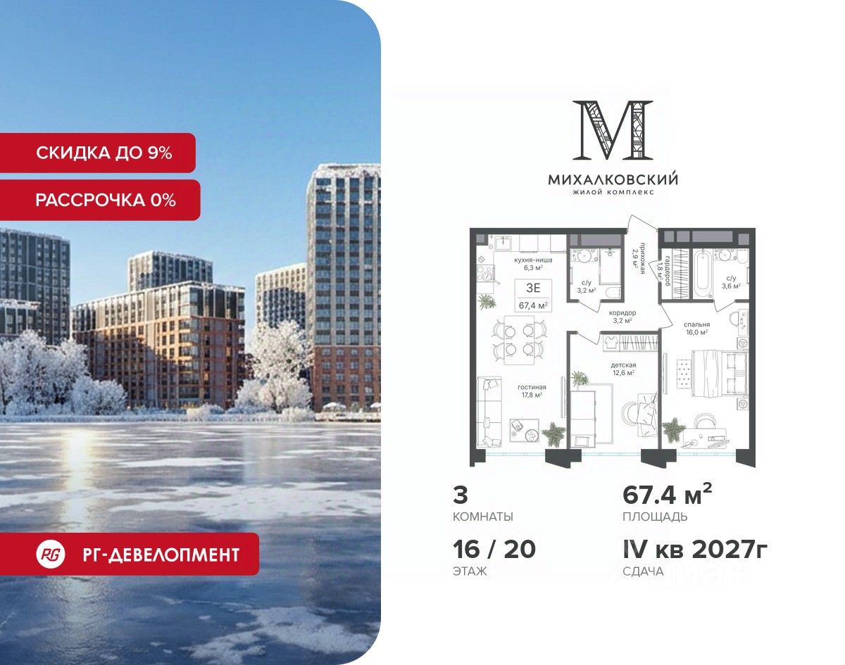 Продаётся 3-к квартира 67,4 кв.м. в ЖК "Михалковский" на 16-м этаже 20 этажного дома.