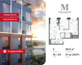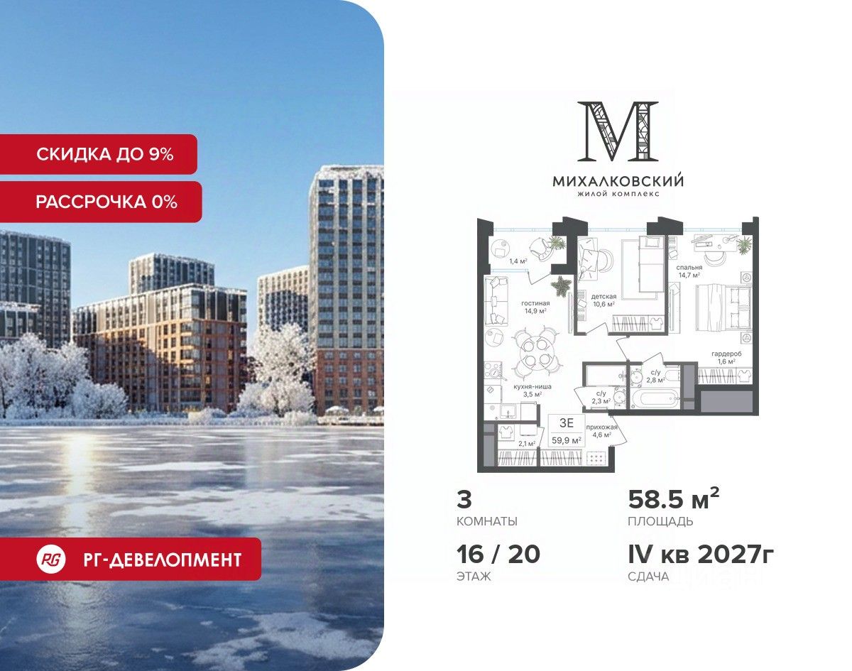 Продаётся 3-к квартира 58,5 кв.м. в ЖК "Михалковский" на 16-м этаже 20 этажного дома.