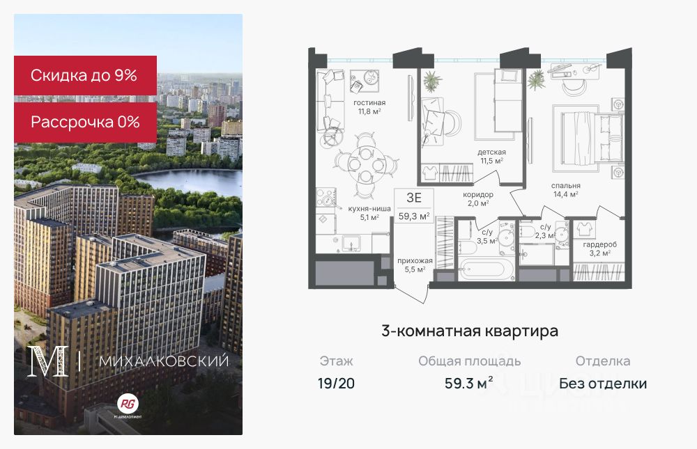 Продаётся 3-к квартира 59,3 кв.м. в ЖК "Михалковский" на 19-м этаже 20 этажного дома.