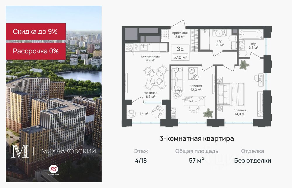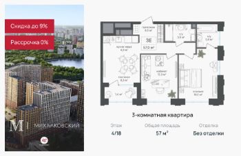 Продаётся 3-к квартира 57,0 кв.м. в ЖК "Михалковский" на 4-м этаже 18 этажного дома.