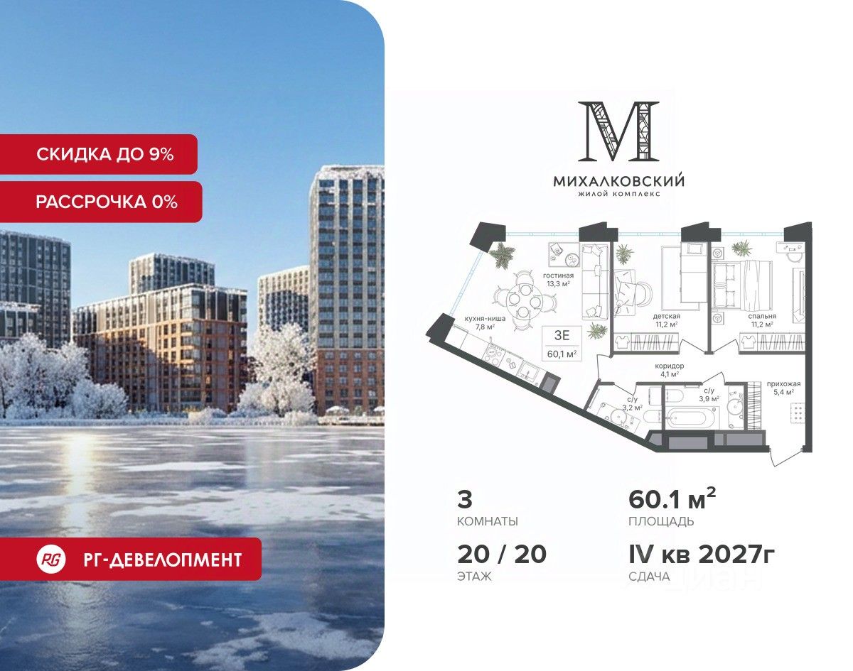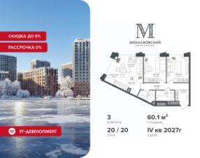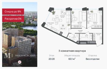 Продаётся 3-к квартира 60,1 кв.м. в ЖК "Михалковский" на 20-м этаже 20 этажного дома.