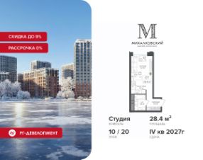 Продаётся студия 28,4 кв.м. в ЖК "Михалковский" на 10-м этаже 20 этажного дома.