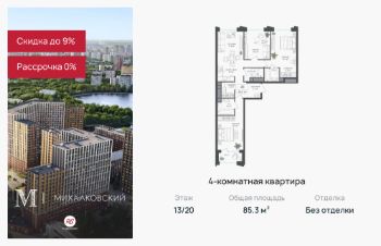 Продаётся 4-к квартира 85,3 кв.м. в ЖК "Михалковский" на 13-м этаже 20 этажного дома.