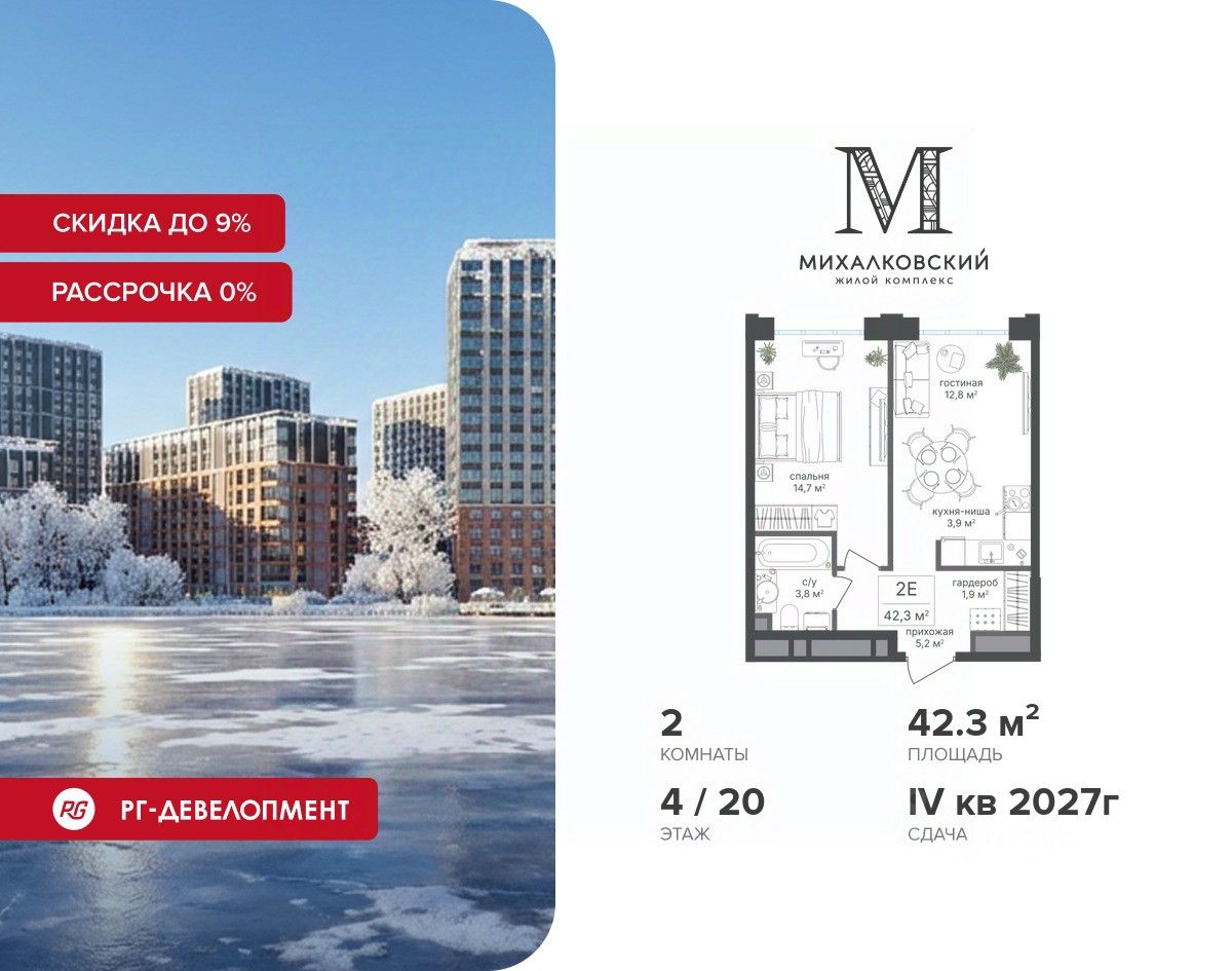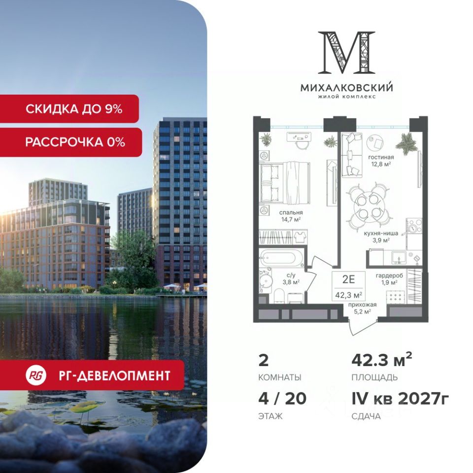 Продаётся 2-к квартира 42,3 кв.м. в ЖК "Михалковский" на 4-м этаже 20 этажного дома.