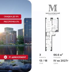 Продаётся 3-к квартира 66,6 кв.м. в ЖК "Михалковский" на 13-м этаже 18 этажного дома.