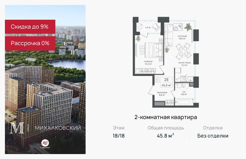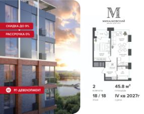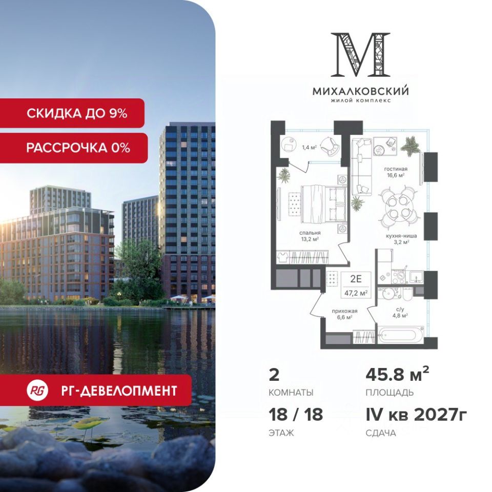 Продаётся 2-к квартира 45,8 кв.м. в ЖК "Михалковский" на 18-м этаже 18 этажного дома.