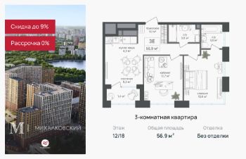 Продаётся 3-к квартира 56,9 кв.м. в ЖК "Михалковский" на 12-м этаже 18 этажного дома.