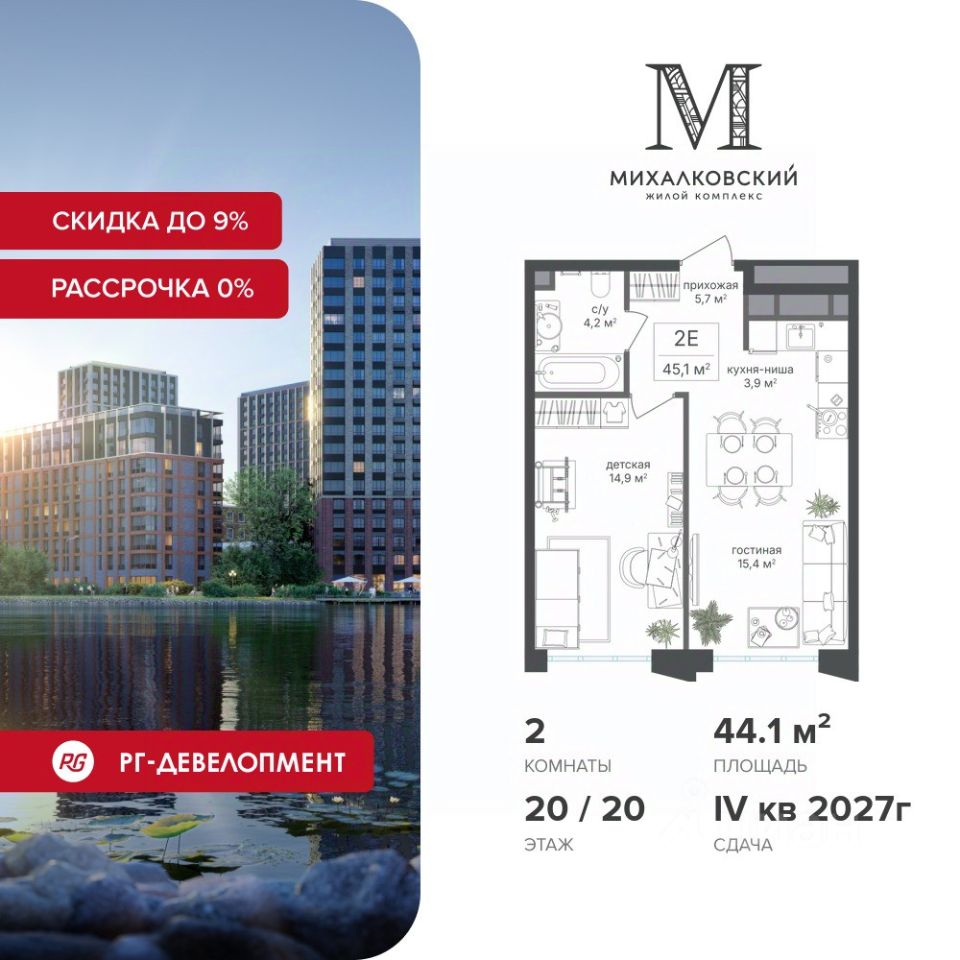 Продаётся 2-к квартира 44,1 кв.м. в ЖК "Михалковский" на 20-м этаже 20 этажного дома.