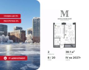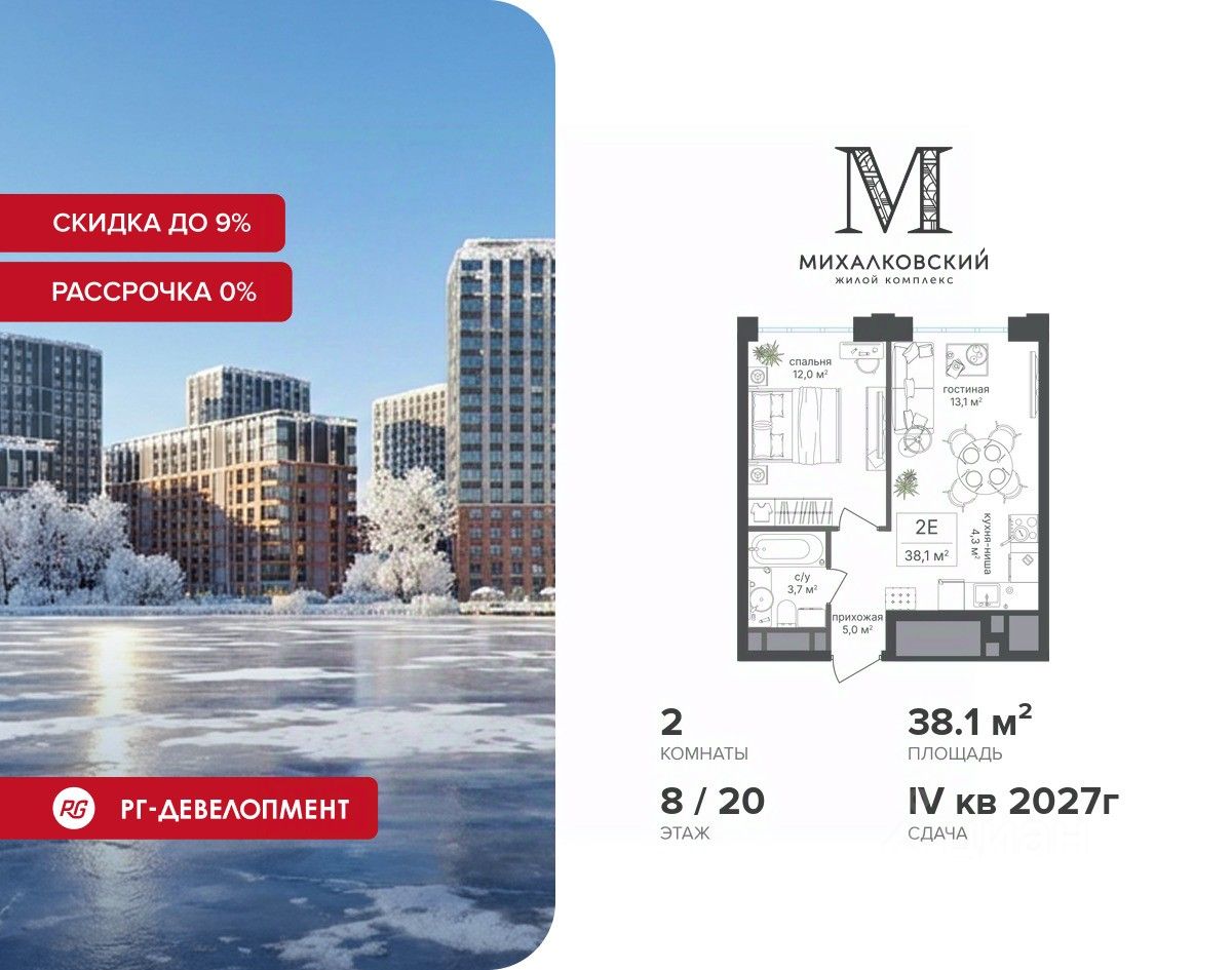 Продаётся 2-к квартира 38,1 кв.м. в ЖК "Михалковский" на 8-м этаже 20 этажного дома.