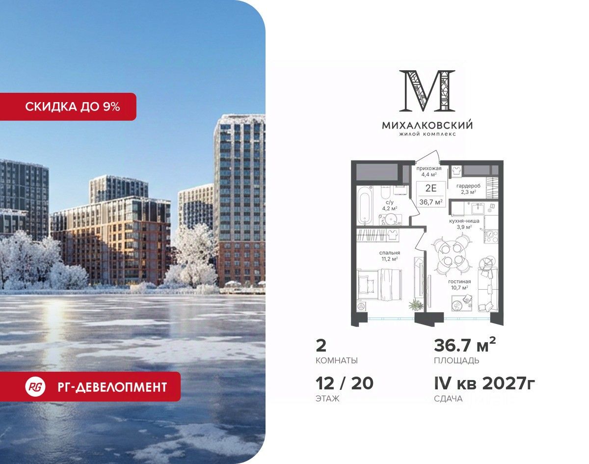 Продаётся 2-к квартира 36,7 кв.м. в ЖК "Михалковский" на 12-м этаже 20 этажного дома.