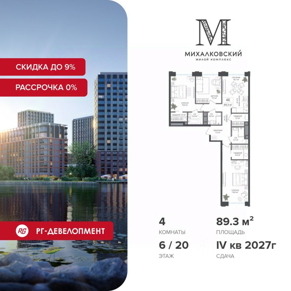 Продаётся 4-к квартира 89,3 кв.м. в ЖК "Михалковский" на 6-м этаже 20 этажного дома.