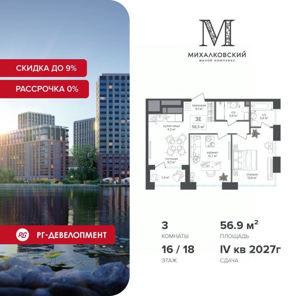 Продаётся 3-к квартира 56,9 кв.м. в ЖК "Михалковский" на 16-м этаже 18 этажного дома.