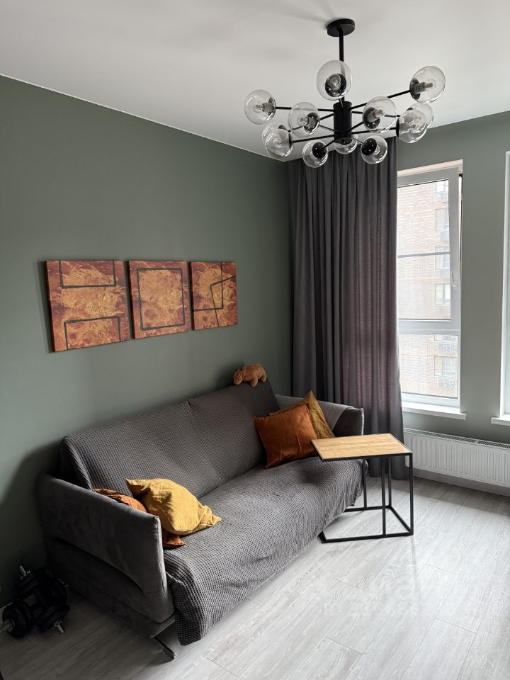 Ремонт сделан в 2022г для себя с применением качественных черновых и чистовых материалов. Коммуникации от застройщика полностью переложены. Натяжные потолки, ламинат Egger, стены покрашены, стильные двери с магнитными замками и качественной фурнитурой.