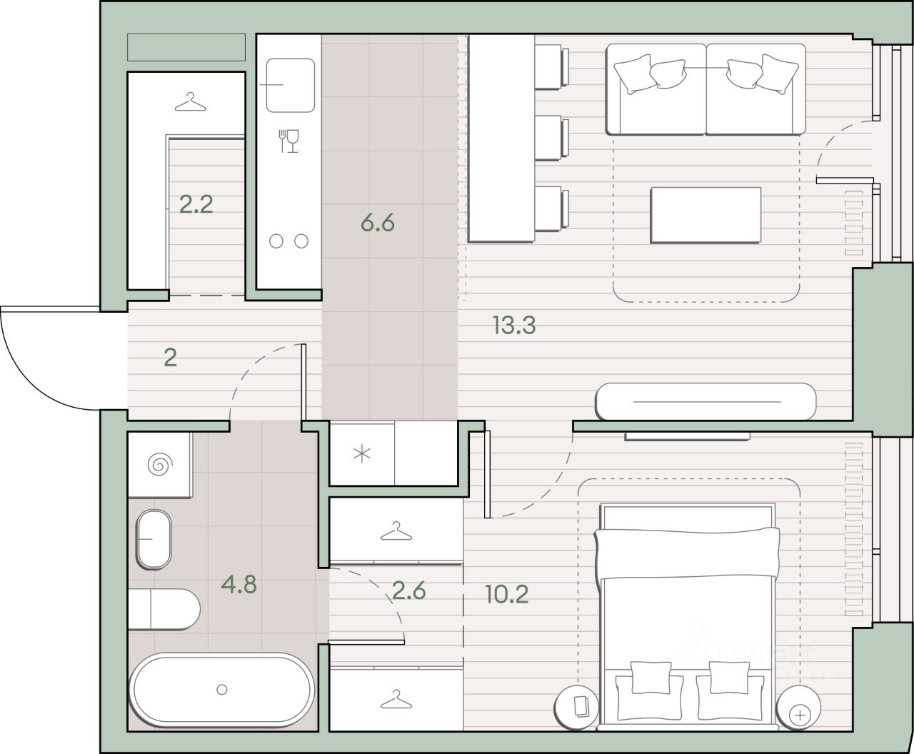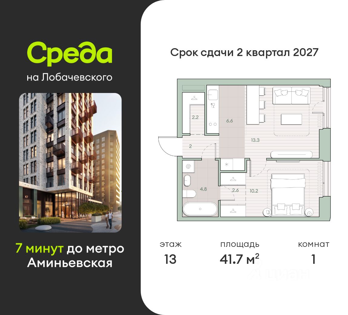Продаётся 1-комнатная квартира общей площадью 41.7 кв.м. с отделкой white box. Квартира расположена на 13 этаже корпуса 5.4 в жилом комплексе бизнес-класса "Среда на Лобачевского" в пешей доступности от метро "Аминьевская".
