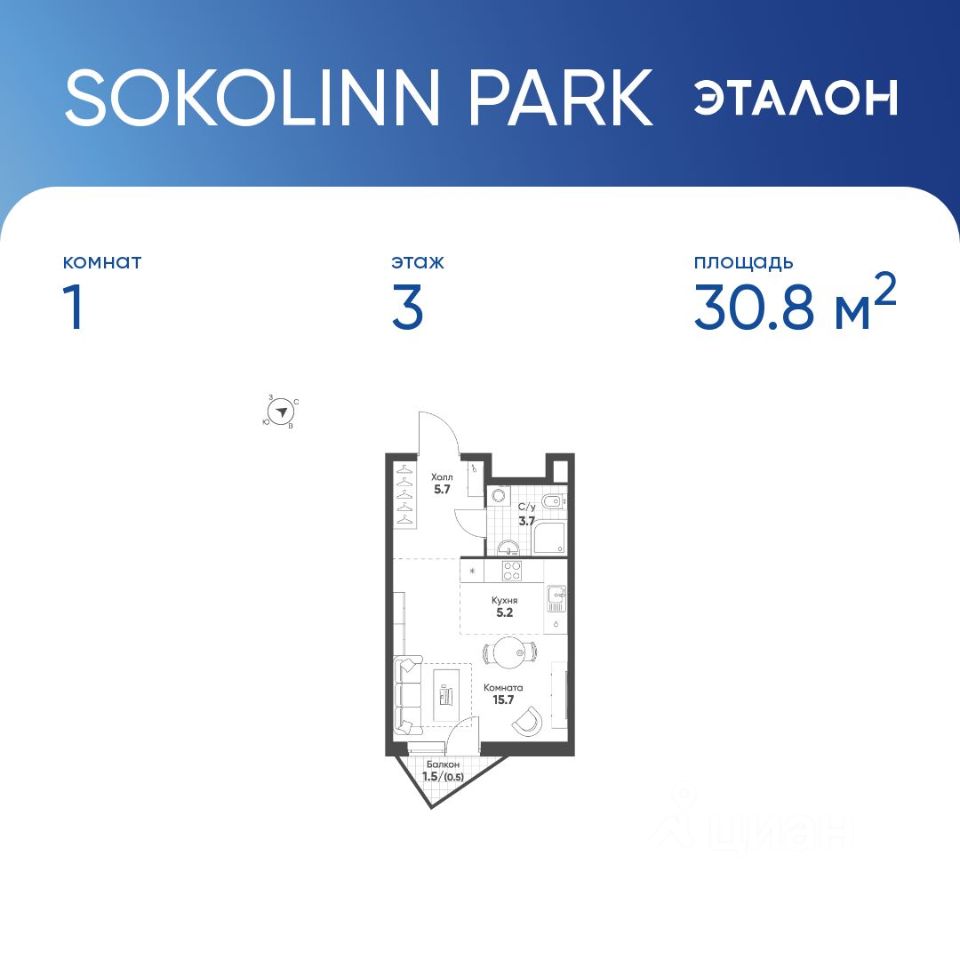 Продается квартира 11, по адресу г. Москва, ВАО, Богородское, 3-я Гражданская ул., влд.1, корпус Sokolinn Park, корпус 1 в Sokolinn Park на 3 этаже, с площадью 30.8 м2.