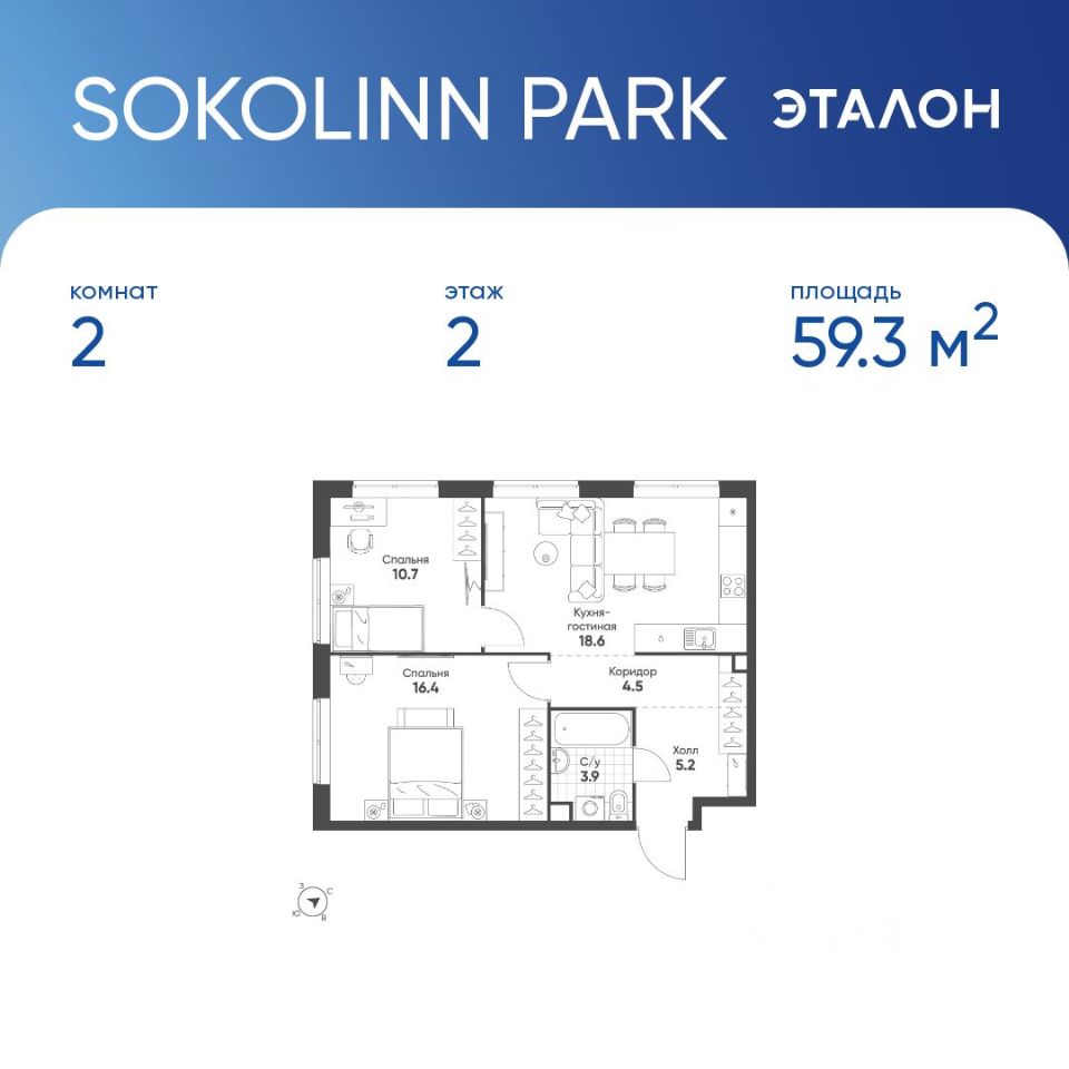 Продается квартира 4, по адресу г. Москва, ВАО, Богородское, 3-я Гражданская ул., влд.1, корпус Sokolinn Park, корпус 1 в Sokolinn Park на 2 этаже, с площадью 59.3 м2.