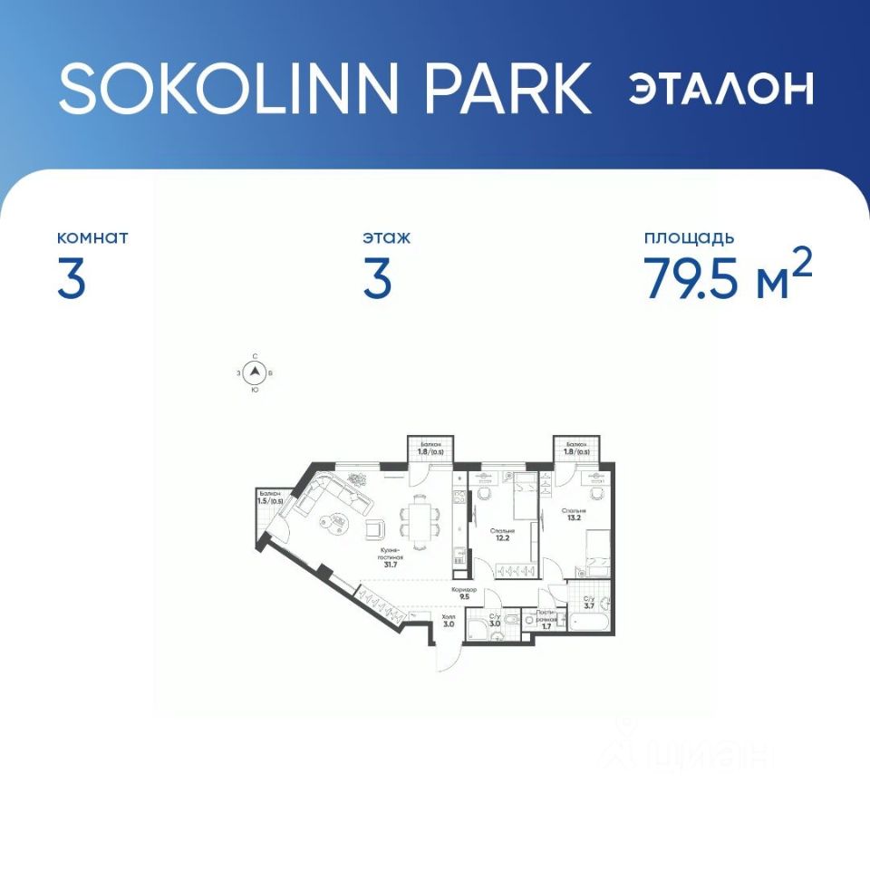 Продается квартира 17, по адресу г. Москва, ВАО, Богородское, 3-я Гражданская ул., влд.1, корпус Sokolinn Park, корпус 1 в Sokolinn Park на 3 этаже, с площадью 79.5 м2.