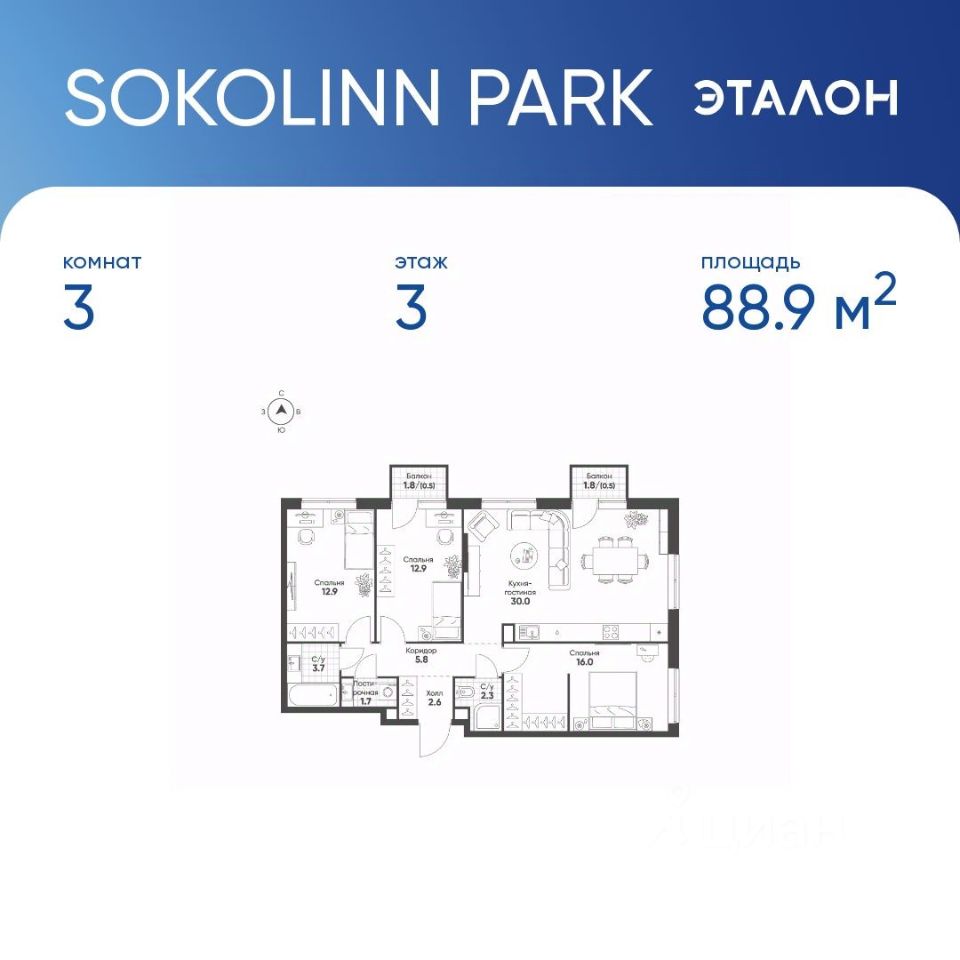 Продается квартира 18, по адресу г. Москва, ВАО, Богородское, 3-я Гражданская ул., влд.1, корпус Sokolinn Park, корпус 1 в Sokolinn Park на 3 этаже, с площадью 88.9 м2.
