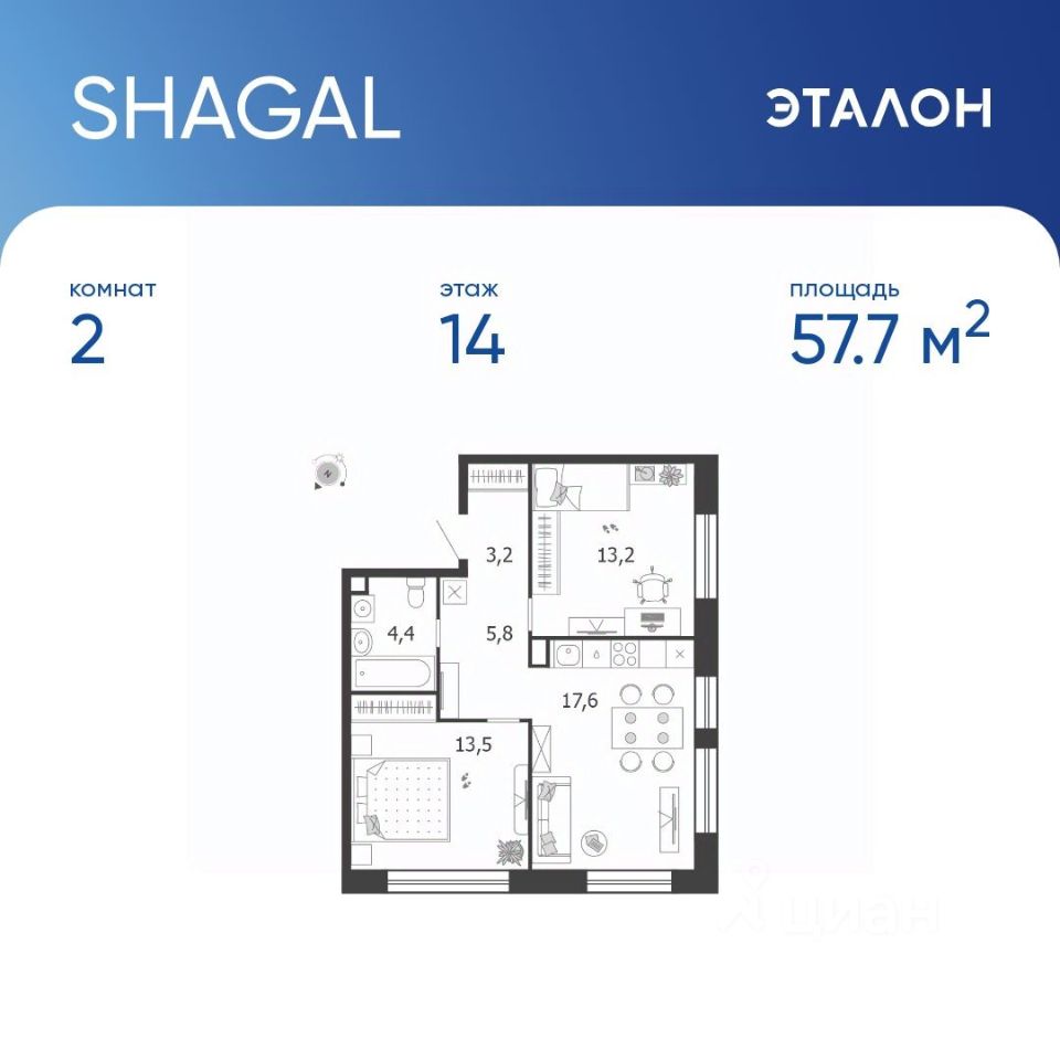 Продается квартира 163, по адресу г. Москва, ЮАО, Даниловский, ул. Автозаводская, вл. 23/75, корпус Жилой квартал Shagal, 3 очередь, 5 этап, корпус 5 в Shagal на 14 этаже, с площадью 57.7 м2.